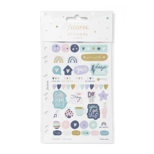 Live your best life with these fun sticker sets from the Filofax Good Vibes Collection. Stickers are repositionable and printed on a matt finish, so that you can easily write on them with pens and markers. This set has been specially designed to fit your A5 or Personal Filofax Organiser or Clipbook or your A5 Refillable Notebook. Includes two decorative sticker sheets, two functional sticker sheets and two planning sticker sheets.