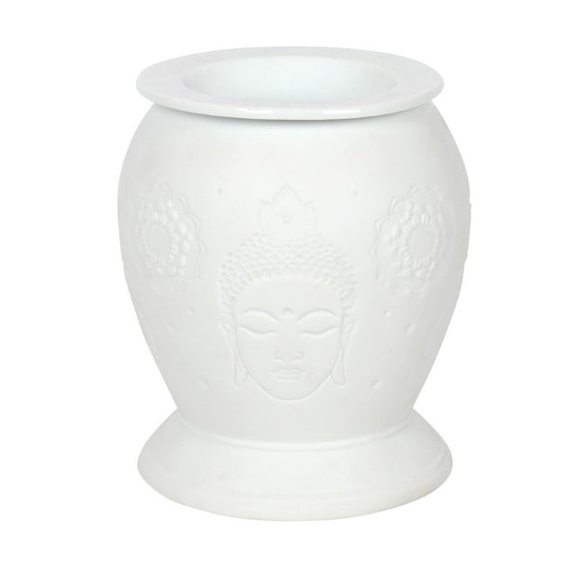 H:15.5 x W:13 x D:13 cm - This white ceramic oil burner and wax melt warmer features a buddha design illuminated by a warm yellow glow when the burner is switched on. Add fragrance oils or soy wax melts to the dish and the gentle warmth from the burner will allow the fragrances to infuse into the home.