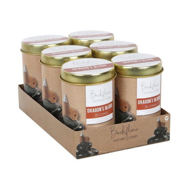 H:10 x W:7 x D:7 cm Tin Dimensions. This cardboard tray includes 6 individual tins of 20 Dragon's Blood backflow incense cones by Elements Home Fragrance. Use in backflow incense burners to create impressive smoke flow displays while fragrancing the home. Approximately 35-40 minutes burn time per jumbo cone. Handmade in India using traditional techniques. Vegan. Read directions before use.