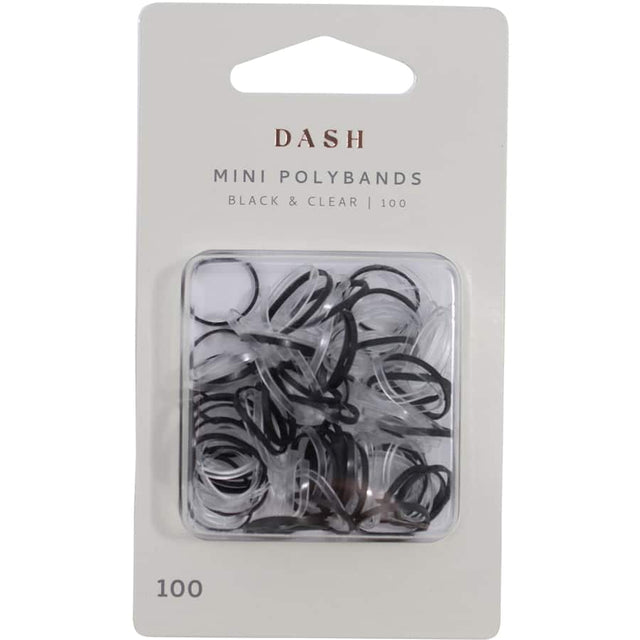 Dash hair ties are essentials for any hair type. These mini polybands will be great for any occasion. Comes in pack of 100 black and clear ties.
