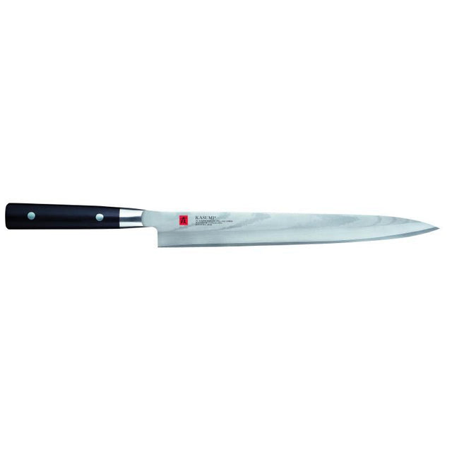Each Kasumi knife boasts a Japanese Pakka wood handle, laminated and resin-impregnated for enhanced grip and longevity, securely fastened with stainless steel rivets. This combination of traditional craftsmanship and modern materials makes the Kasumi Damascus Sashimi Knife an essential addition to your kitchen.