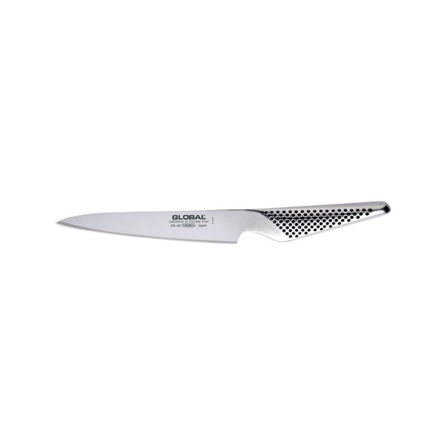Experience precision cutting with the Global GS-60 Utility Knife, measuring 15cm. This versatile kitchen tool excels in everyday tasks, making it an indispensable asset for food enthusiasts and professional chefs alike. Known as a sandwich knife, it easily handles a variety of ingredients, from tomatoes and meats to cheeses, allowing you to achieve razor-thin slices with minimal effort. The GS-60 is expertly crafted from CROMOVA 18 stainless steel, renowned for its ability to hold a razor-sharp edge while resisting rust, stains, and corrosion. Its ice tempered and hardened construction, rated Rockwell C56-58, ensures that the blade remains durable and long-lasting. The knife’s unique features include a 15-degree acute cutting edge for unparalleled performance and superior edge retention, making it the ideal choice for precise culinary applications. Additionally, its smooth contours and seamless design eliminate food and dirt traps, enhancing safety and hygiene in the kitchen. The perfectly balanced handle, calibrated to offset the blade's weight, provides comfort during prolonged use. Not just a tool, the Global GS-60 Utility Knife is an investment in your cooking experience, backed by a lifetime warranty against manufacturing defects. Elevate your kitchen skills with this essential knife, made in Japan and designed for those who appreciate top-tier craftsmanship.