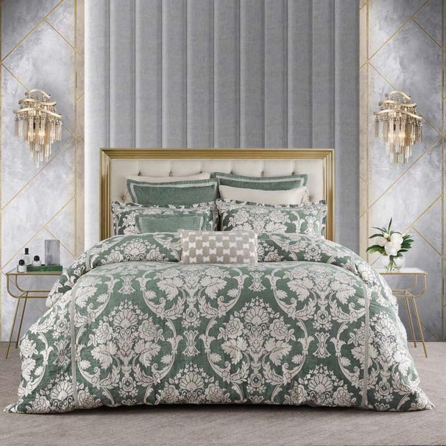 Davinci Coronet Sage Queen Bed Quilt Cover Set combines classic Hamptons style with sensory tactile qualities. Elaborate botanical motifs are woven into a ground of soft chenille in calming sage and white. Complete this look with its coordinating accessories which feature an inset border of ornate brocade.