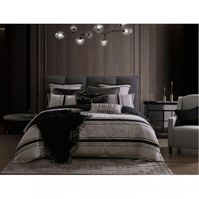 Davinci Gambusi Smoke Quilt/Duvet Set in Super King size is a luxurious addition to your bedroom. Crafted with 100% Polyester chenille, this contemporary set features tonal metallic stripes for a modern touch. The self-flanged edges with twisted rope cord in black add a sophisticated flair. This set includes a Quilt Cover measuring 270 x 240cm and 2 pillowcases, perfect for enhancing your bedding ensemble. Care instructions include turning the cover inside out before washing, gentle machine wash, and line dry inside out in the shade for optimal maintenance. Elevate your sleep space with the elegance of Davinci Gambusi Smoke Quilt/Duvet Set.