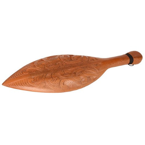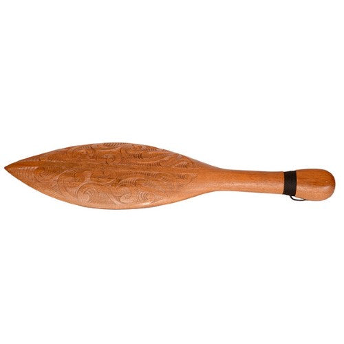 Intricately carved Maori waka paddle wall hanging. Customers use these carvings as a 21st gift instead of the traditional key. Also popular as a trophy or award. When hung on he wall it hangs vertically from the black cord binding. Hand carved from Mahogany wood.