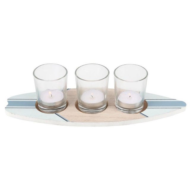 H: x W: x D: cm - This candle holder holds 3 tealights and comes in the shape of a surfboard. Great for creating a cosy feel in any beach house or nautical home. Part of the Surf's Up collection of nautical gifts and decor.