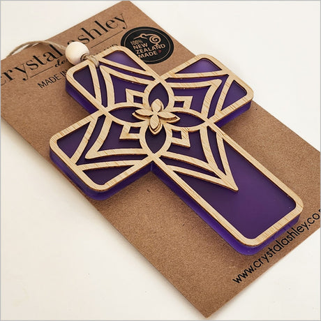 Hanging Ornament - Cross 10 Kowhaiwhai 1 (Purple Satin Acrylic)