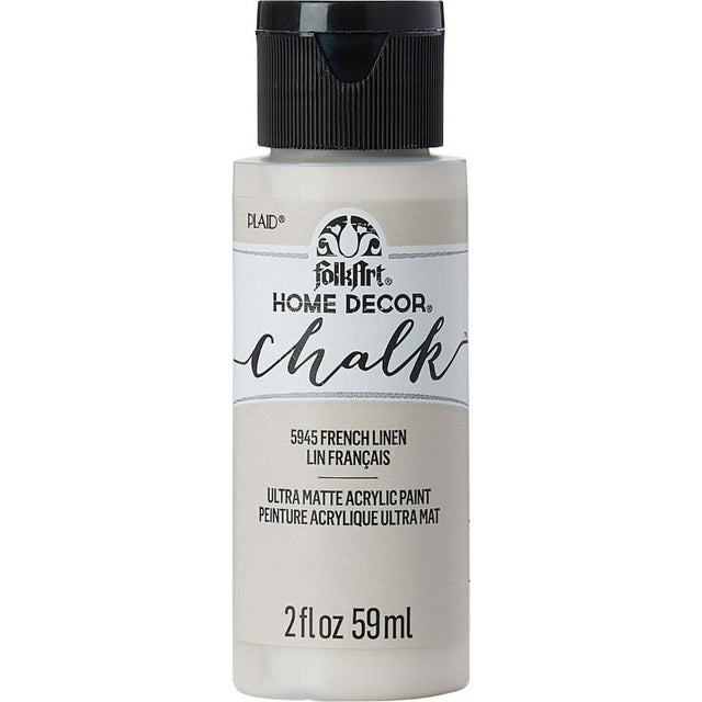 Elevate your home decor with FolkArt Home Decor Chalk Acrylic Paint in FRENCH LINEN 5945, a stunning 2oz (59ml) solution for all your creative needs. This premium chalk finish paint boasts a rich, highly pigmented formula perfect for achieving a long-lasting, beautiful look in your DIY projects. Whether you're revamping old furniture, transforming decorative glass, or enhancing various home decor accessories, this versatile acrylic paint is your go-to choice. It dries to a gorgeous ultra-matte finish, requiring minimal surface preparation and allowing you to distress and layer for that sought-after vintage appearance.