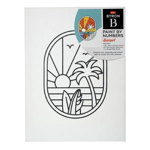 Unleash your creativity with the Jasart Byron Paint By Numbers - Sunset! This engaging kit lets both beginners and experienced artists paint vibrant sunsets on a high-quality 280gsm stretched canvas. Ideal for relaxation, this DIY set features bright colors capturing summer's essence, making an excellent addition to your art collection or a thoughtful gift. The 30 x 40 cm canvas includes everything needed to create a stunning masterpiece: 4 designs, 6 easy-to-use paint pots, a round brush, a flat brush, and a detailed A4 instruction sheet. Enjoy a fun way to unwind or enhance your artistic skills with this paint by numbers kit. Fill each numbered section and blend colors to create a beautiful sunset scene to display proudly at home. Embrace the paint by numbers trend, and experience the joy of completing your own artwork while enjoying a peaceful afternoon of creativity. More than just an art project, it’s a perfect way to relax, socialize, and reconnect with your artistic side. Plus, packaged with a color corner sticker, it makes a great gift for art enthusiasts or anyone eager to explore their creativity!