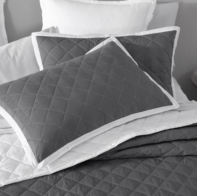 Upgrade your bedroom decor with this luxurious QUILTED Pillowcase SHAM PAIR in the timeless ESSEX CHARCOAL design. Crafted from high-quality materials, these pillowcases offer both style and comfort, ensuring a cozy night's sleep. The classic quilted pattern adds elegance to your bedding ensemble, while the charcoal color effortlessly complements any room decor. Each pillowcase is finished with a crisp white bound edge, providing a tailored and sophisticated look. These pillowcases are versatile and suitable for year-round use, making them a must-have for any season. Enhance your bedding collection with this exquisite sham pair and elevate your sleep experience. Make a statement with the ESSEX CHARCOAL QUILTED Pillowcase SHAM PAIR today!