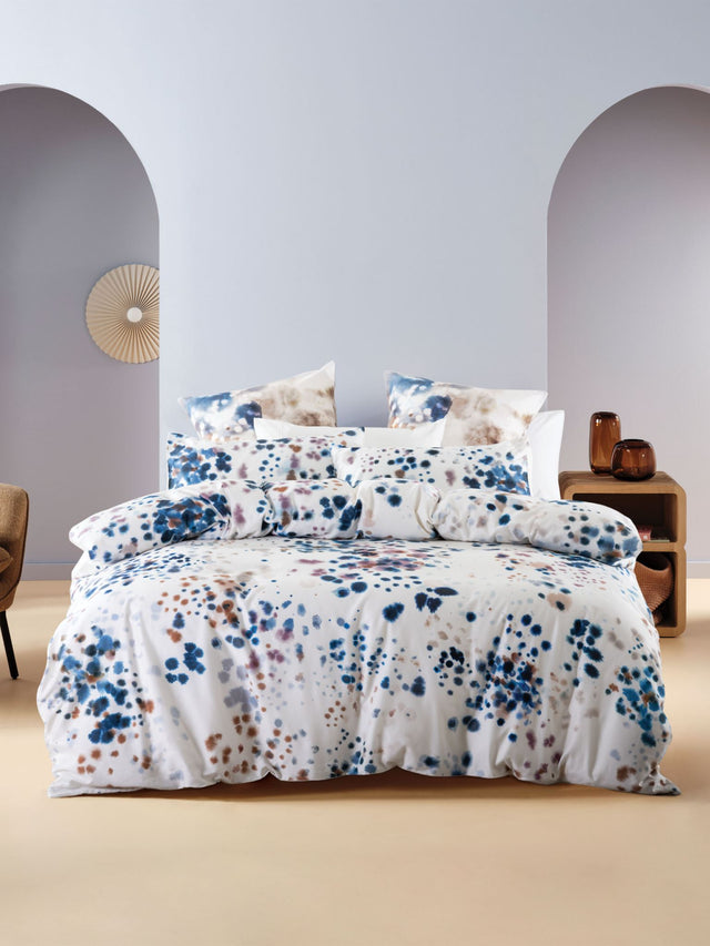 Watercolour droplets are speckled across a white base to make colourful, painterly details pop. In an artful blend of rich and soft blues, warm browns and muted purples, Wilder is printed on cotton sateen and can be matched with a pair of the co-ordinating European pillowcases to complete the modern aesthetic
