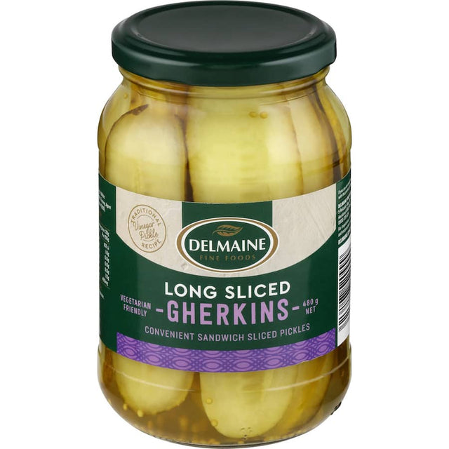 Add a delightful crunch to your sandwiches with Delmaine Gherkins Long Sliced. These tangy gherkins, pre-sliced for your convenience, offer the same sweet & sour flavor you love. Perfect for elevating your sandwich game, these gherkins are a versatile addition to wraps, paninis, and more. Enjoy the perfect balance of flavors by combining these gherkins with meats, cheeses, or your favorite spreads. Get your jar of Delmaine Gherkins Long Sliced today and enhance your sandwich creations!