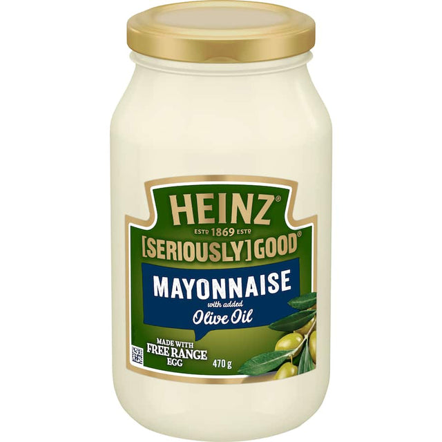 Indulge in the creamy perfection of Heinz Seriously Good Mayonnaise with Olive Oil, a game-changer for your culinary creations. Crafted with high-quality ingredients, this mayonnaise features free range eggs and the rich flavor of olive oil, making it the ideal condiment for burgers, sandwiches, and salads. Say goodbye to bland condiments and elevate your meals with Heinz Seriously Good Mayonnaise. Perfect for homemade coleslaw, potato salads, and dips, this versatile mayo adds a luxurious touch to any dish. Best of all, you can feel good about what you're serving your family, as it contains no artificial flavours or colours. Whether you're whipping up a delicious sandwich spread with tuna or egg, or simply enjoying it with crispy hot chips, this mayonnaise is sure to become your go-to ingredient. With its irresistibly creamy texture and satisfying taste, Heinz Seriously Good Mayonnaise with Olive Oil is the must-have addition to your kitchen. Discover why this mayo is loved by so many and take your culinary experience to new heights with Heinz. Perfect for casual dining and gourmet meals alike, stock up today and make mealtime more enjoyable with Heinz Seriously Good Mayonnaise. Grab a jar and transform your dishes into mouthwatering masterpieces!