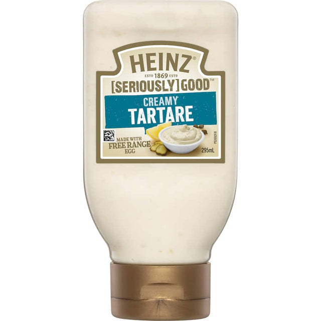 The perfect accompaniment to seafood and fish and chips, Heinz [SERIOUSLY] GOOD Creamy Tartare is an essential summertime sauce. This tartare is made with free range egg for a velvety mayo base, with an added tang from gherkins, lemon juice, capers and more. Heinz [SERIOUSLY] GOOD Creamy Tartare contains no added flavours and no artificial colours. This creamy sauce can be used as a dip for hot chips and onion rings, drizzled over fish cakes or pan-fried fish or even as a dressing for salads and roasted vegetables. Trust us when we say this tartare is [SERIOUSLY] GOOD.