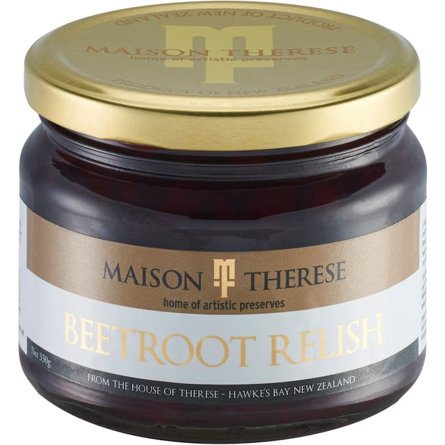 Maison Therese Relish Beetroot is a delightful addition to your pantry, boasting a sweet, chunky texture and a vibrant red hue thanks to the use of fresh beetroot. Elevate your meals with this relish, perfect for burgers, sandwiches, or paired with cheese on crackers. Handcrafted with care, this relish offers a burst of flavor that will leave you craving for more. Whether you're a foodie or a casual snacker, this beetroot relish is bound to impress your taste buds. Stock up on Maison Therese Relish Beetroot today and add a touch of gourmet flair to your culinary creations.