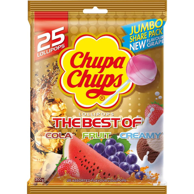 Indulge in the delightful flavors of Chupa Chups with the Best Of Bag, containing 300g of pure lollipop joy! This exciting package features 25 deliciously diverse Chupa Chups lollipops, perfect for sharing or enjoying yourself. Each lollipop is a burst of nostalgia and sweetness, making it an ideal treat for kids and adults alike. Our Chupa Chups Best Of Bag includes a variety of vibrant flavors, ensuring there's something for everyone. Whether you’re looking for a quick snack, party favors, or simply a sweet pick-me-up, these iconic lollipops are the perfect solution. Made with quality ingredients, Chupa Chups are gluten-free and suitable for vegetarians. Perfect for birthdays, celebrations, or just a delightful treat at home, this bag is your go-to for satisfying your sweet tooth. Add the Chupa Chups Lollipops Best Of Bag 300g 25pack to your cart today and relish the joy of these classic treats any time you want! It's time to savor the flavors, share the fun, and enjoy the magic of Chupa Chups, the world-famous lollipop brand. Perfect for candy lovers, this lollipop pack is an unmissable addition to your snack collection. Experience the joy and excitement of these timeless sweets with every lick!
