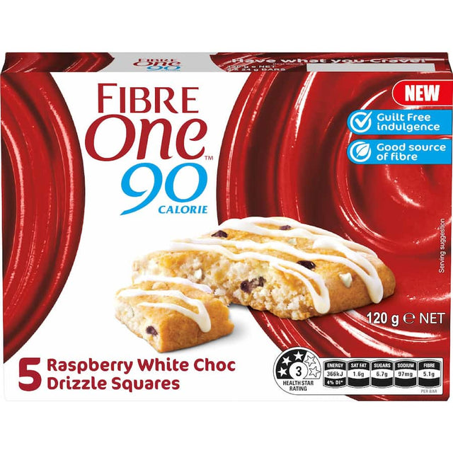 Discover the delightful taste of **Fibre One Cake Bars Raspberry White Choc Drizzle** - a perfect guilt-free treat for snack lovers! Each pack contains 5 indulgent bars, weighing a total of 120g. These **low-calorie cake bars** combine the sweet and tangy flavor of raspberry with the rich creaminess of white chocolate drizzle, creating a delicious balance that your taste buds will adore. With **only 90 calories per bar**, they make an ideal snack for those on a weight management journey or anyone looking to satisfy their sweet cravings without the guilt. Packed with **fibre to support your digestive health**, these cake bars fit perfectly into any healthy lifestyle. Enjoy them at home, as a perfect addition to your lunch box, or during your commute. Whether you’re craving an afternoon treat or a post-dinner dessert, **Fibre One Raspberry White Choc Bars** are the perfect choice for any occasion. Get your hands on this tasty snack and experience the perfect blend of flavour, texture, and health benefits. Order now and elevate your snack time with this delicious treat that keeps you on track with your health goals!