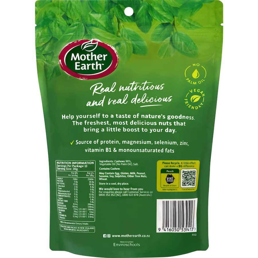 Introducing Mother Earth Cashews Roasted & Salted 400g – the perfect blend of flavor and nutrition that brings nature's goodness right to your fingertips! These premium, roasted and salted cashews are not just a snack; they are an experience. Each handful is packed with healthy fats, protein, and essential nutrients, making them an ideal option for both casual munching and health-conscious diets. Our cashews are sourced from the finest farms, ensuring you get only the freshest and most delicious nuts available. Whether you enjoy them on their own, toss them in a salad, or use them in your favorite recipes, Mother Earth Cashews Roasted & Salted are here to add that perfect crunch to your day. Perfect for a quick energy boost, these roasted cashews are gluten-free, vegan, and contain no artificial additives, making them a guilt-free treat you can savor anytime. Elevate your snacking game and indulge in a bag of Mother Earth Cashews today – because you deserve the best in health and flavor!