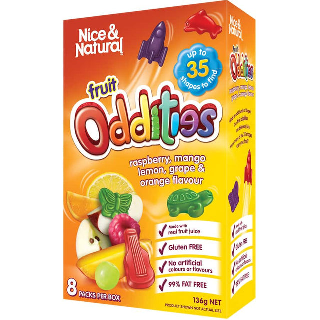 Nice & natural fruit oddities raspberry, mango, lemon, grape & orange flavour are deliciously juicy. Made with real fruit juice, no artificial colours or flavours, gluten free and 99% fat free.