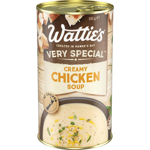 Discover the rich and comforting taste of Wattie's Very Special™ Creamy Chicken Soup. This velvety smooth chicken soup is crafted with care, featuring premium New Zealand chicken, expertly blended with a delightful mix of herbs and spices. Perfect for a quick and satisfying dinner, this creamy chicken soup is not only easy to heat in the microwave, making it an ideal choice for busy work lunches, but it also transforms ordinary meals into extraordinary experiences. Pour it over browned chicken breast for a sumptuous baking dish or savor it on its own with a fresh baguette. Hand-selected ingredients ensure that Wattie's Very Special™ Creamy Chicken Soup contains no artificial colors or preservatives, delivering the purest flavors only. Enjoy quality and convenience with every spoonful of this delicious canned soup. Whether you're looking for an easy lunch solution or a cozy dinner option, Wattie's Very Special™ Creamy Chicken Soup is your go-to comfort food that you can count on. Bring home this classic New Zealand recipe today and taste the difference!
