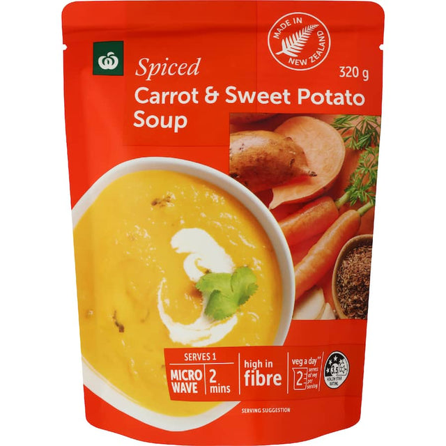 Indulge in the wholesome goodness of Woolworths Soup Carrot & Sweet Potato Pouch 320g—a delicious and nutritious blend that warms you from the inside out. This delightful soup is expertly crafted with 33% fresh carrots and 11% sweet potatoes, ensuring each spoonful is packed with flavor and essential nutrients. Perfect for a quick lunch or a cozy dinner, this convenient pouch offers a satisfying and healthy meal option. The rich and creamy texture, achieved with quality ingredients like cream, onion, and garlic, makes it a delightful choice for any meal. Seasoned with ginger, coriander, and spices such as black pepper and chili, this carrot and sweet potato soup delivers a comforting taste that will please your palate. Whether you are on a health journey or simply looking for a convenient meal solution, Woolworths Soup Carrot & Sweet Potato is the perfect fit. Enjoy it with crusty bread for the ultimate comfort food experience. Dive into this nutritious soup that’s not only delicious but also easy to prepare, making it a great addition to your pantry. Treat yourself to a bowl of nutritious goodness—order your Woolworths Soup Carrot & Sweet Potato Pouch today and enjoy a heartwarming meal at any time of day.