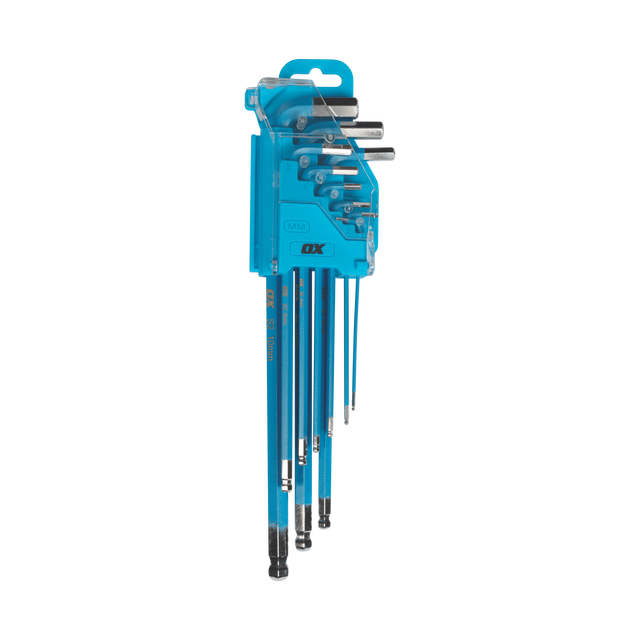 The OX Pro Hex Allen Key Long 9pc Set is built for precision and durability. Featuring a ballpoint tip, it allows a wider range of access to bolt heads, making it ideal for tight spaces. Made from tough S2 steel, this set is engineered to withstand heavy use. The keys are color-coded blue, conforming to industry standards, so you can easily identify them as a Hex key set. A protective coating ensures both the tools and your work surfaces stay in top condition. Choose OX for professional quality.