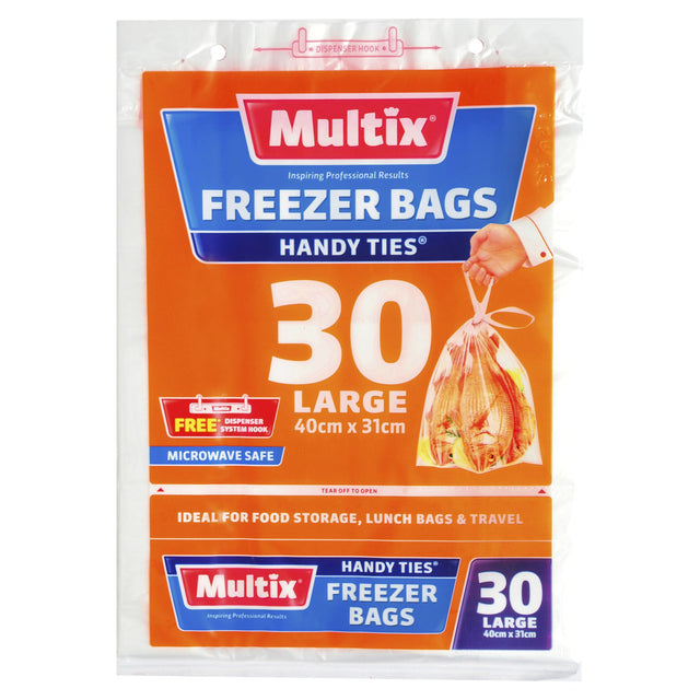30 Large Multix Freezer Bags with handy ties. Ideal for food storage, lunch bags & travel. They are microwave safe. Size: 40cm x 31cm.