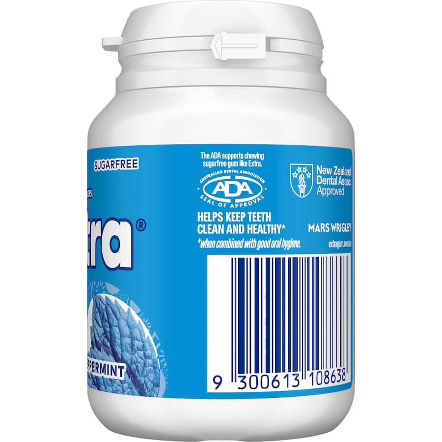 Wrigleys extra® sugar free chewing gum. avaliable in peppermint flavour in convenient bottle pack.