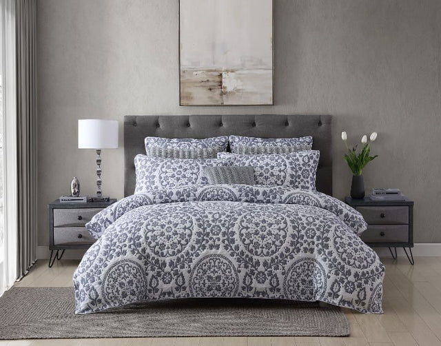 Astille Blue features intricatley woven medallions in blue, cleverly enhanced by the softness of quilted matelasse. Elegantly finished with self-flanged edges trimmed with cord piping, Astille's co-ordinating and reversible accessories including a European pillowcase and decorator cushion, allow for multiple styling options. The cover easily converts to a coverlet by simply removing the inner quilt.