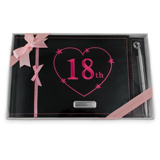 Celebrate the milestone of turning 18 with our elegant Pink 18th Guest Book with Pen, a perfect keepsake for any special birthday celebration. This sophisticated guest book features a luxurious black fabric cover, beautifully embroidered with a stunning pink design to capture the essence of the moment. A premium quality silver metal pen is expertly attached to this guest book, allowing friends and family to leave heartfelt messages and well wishes with ease. The pen, filled with smooth black ink, ensures a delightful writing experience.