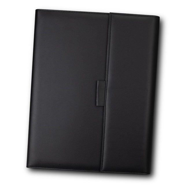 Smart PU leather portfolio with a sleek dome closure and a PU pen loop. It comes with an A4 lined pad, two slip pockets, and six business card holders. It is presented in an individual black cardboard sleeve.