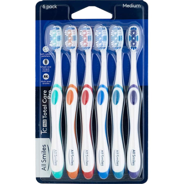 Introducing the All Smiles Total Care Pro Toothbrush Medium 6pk, your essential companion for optimal oral hygiene. This premium toothbrush is expertly designed to deliver superior dental care, ensuring a thorough clean for your teeth and gums. With medium bristles, it provides the perfect blend of gentle yet effective cleaning, making it ideal for all users seeking a healthier smile.