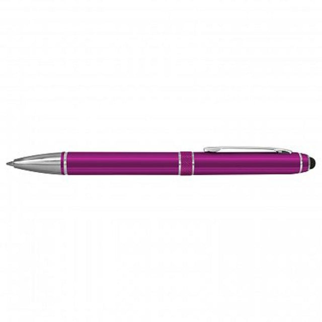 Twist action aluminium ball pen with a shiny anodised barrel, shiny chrome accents and a stylus for use with touch screens. It has a black large volume refill with 800 metres of writing ink.