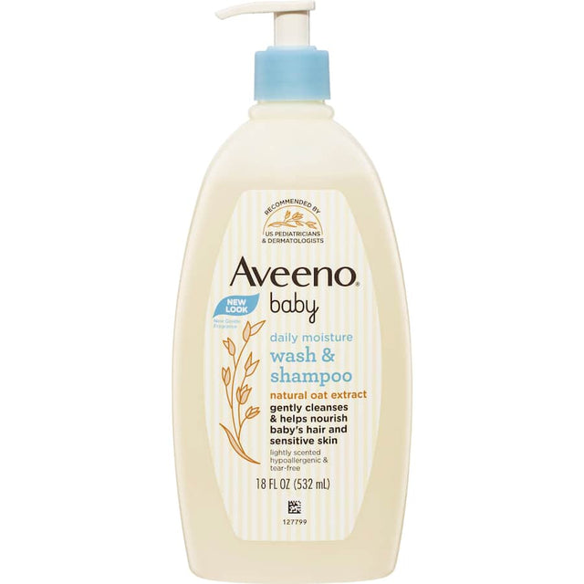 Aveeno Baby Daily Moisture Wash & Shampoo cleanses skin and hair without drying for everyday use, formulated with natural oat to be gentle for babies sensitive skin.