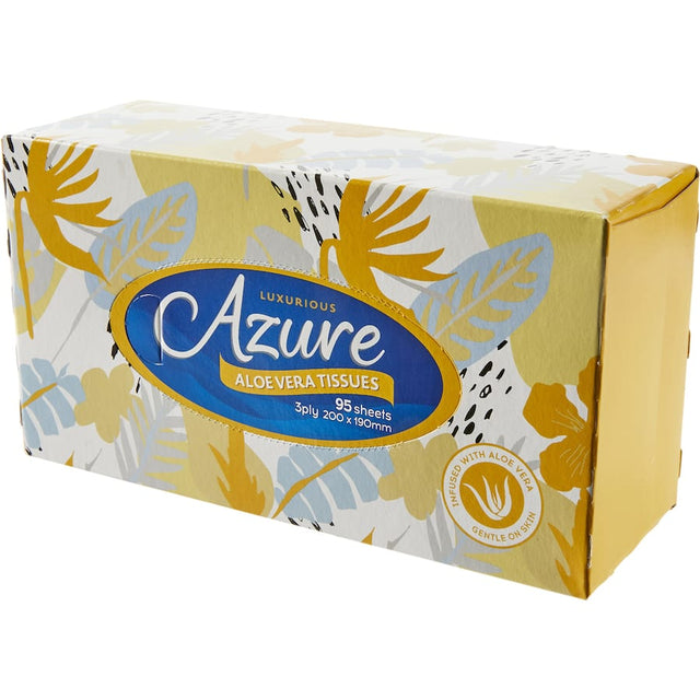 Each pack contains 95 high-quality tissues, ensuring you never run out when you need them the most. Whether you're at home, in the office, or on the go, Azure Tissues are a must-have item in your health and body care routine. Enjoy the gentle embrace of aloe vera and the reliability of 3-ply construction, tailored for those who value quality and comfort.