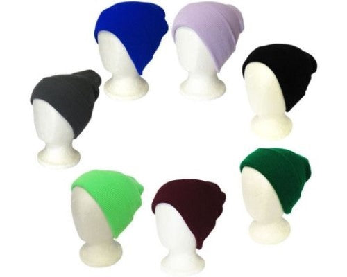 A colour assortment of 7 warm beanies; double layered acrylic knit fabric with ribbing. These beanies are one size fits most, with plenty of stretch in them