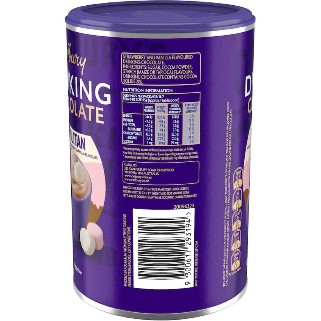 Crafted with quality ingredients, this drinking chocolate is easy to prepare: just mix it with your choice of milk, stir, and savor the deliciously familiar Neapolitan flavors that we all love. It's not just a drink; it's an experience that brings joy to both children and adults alike. Make each sip a moment to remember with Cadbury Drinking Chocolate Neapolitan, available now at Smartfox AU. Treat yourself to a nostalgic flavor journey today and elevate your beverage game with this special blend.