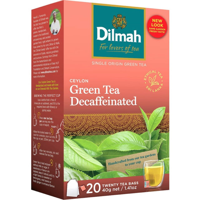 Discover the refreshing taste of Dilmah Green Tea Natural Decaf, a pure Ceylon green tea that promises a delightful experience without caffeine. Handpicked from the lush, pristine mountains of Sri Lanka, this decaffeinated tea is grown at an elevation of approximately 6500ft, ensuring a unique flavor profile that embodies the essence of high-quality tea. Dilmah's commitment to sustainability is evident in its eco-friendly decaffeination process, allowing you to enjoy a cup that retains all the natural goodness and characteristics of premium Ceylon tea.