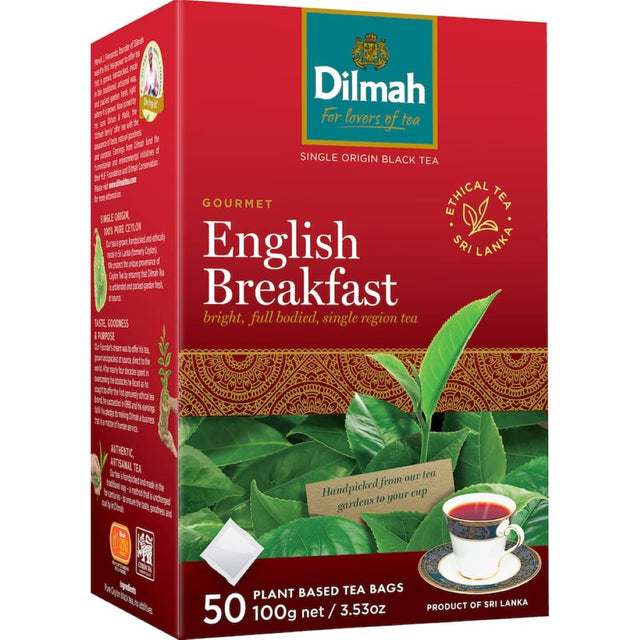 Discover the rich and invigorating flavor of Dilmah Tea’s English Breakfast Tagless tea bags, crafted from 100% pure Ceylon single-origin black tea sourced from the breathtaking Dimbula Valley. At an elevation of around 1,500 meters, this exquisite tea embodies the perfect harmony of strength, character, and brightness, making it the ultimate full-bodied breakfast tea to kickstart your day. Each box contains 50 tagless tea bags, designed for your convenience without compromising on quality.
