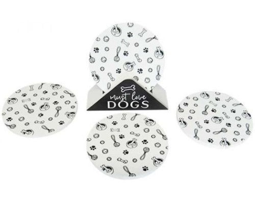 Set of four sealed MDF coasters with dog-theme in a handy holder. Coasters 10 cm diameter.