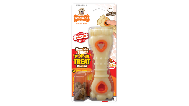 Give your dog the ultimate chewing challenge with the Power Chew Knuckle Bone Combo! Made of sturdy nylon, this long-lasting combo toy stands up to the most aggressive chewers and takes their Nylabone to the next level! Add All-Natural Pop-In Treats to this refillable dog toy for a treat and chews time that lasts longer and tastes more delicious! These easy-to-load chicken dog treats securely fit in the chew toy and allows your dog to enjoy each treat from both sides. Small in size and big in flavour, the treats are highly digestible, contain limited ingredients, and are proudly made in the USA. Adding to the enjoyment, the knucklebone chew toy contains delicious chicken flavour throughout and will satisfy your dog's natural urge to chew. Plus, it features nubs and ridges that help clean teeth and freshens breath through chewing action. Whether you want to challenge your furry friend or simply reward them for being a good dog, this treat chew toy combo will keep them happy, busy, and satisfied. It's a new and exciting way for dogs to enjoy their Nylabone!