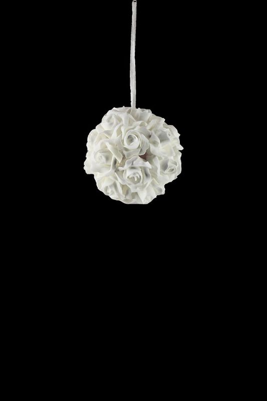A hanging ball of white roses set into a styrene foam ball for varied uses. Great for wedding decorations. Can be sprayed to suit your wedding theme.