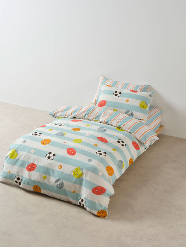 A playful design for sport-loving kids, whether they adore footy, basketball, soccer or tennis. Printed on cotton percale in a fun-loving palette with pops of orange and chartreuse, Have A Ball is finished with cord piping, reverses to a striped print for another aesthetic, and is best styled with our Sailor Stripe sheet set, themed novelty cushions, and accessories.