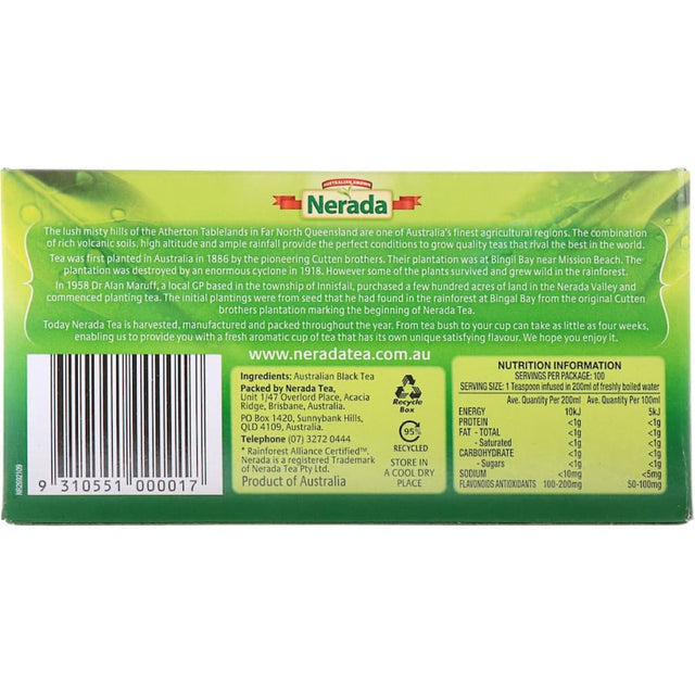 Discover the delightful taste of Nerada Loose Leaf Tea Black, a premium Australian black tea that embodies quality and tradition. Sourced from the lush, misty hills of the Atherton Tablelands in Far North Queensland, Nerada Tea is cultivated under perfect conditions—rich volcanic soils, high altitude, and abundant rainfall. Our Rainforest Alliance Certified black tea not only delivers an exceptional flavor but also ensures environmentally sustainable farming practices. With a heritage dating back to 1886, Nerada uses only the tender young leaves of the Camellia Sinensis plant, hand-harvested every two to four weeks for freshness. Each step of the production, from withering to drying, ensures that the natural antioxidants and robust flavors are preserved, providing a cup of tea that is free from artificial flavors, colors, and preservatives.