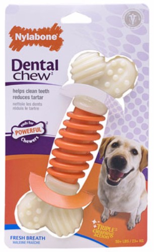 Nylabone - Dental Chew * Pro Action Bone * Helps clean teeth & reduce tartar * Ends for powerful chewers * Promotes fresh breath * Triple cleaning action * Massages gums * Satisfies natural urge to chew *For dogs 23kg +