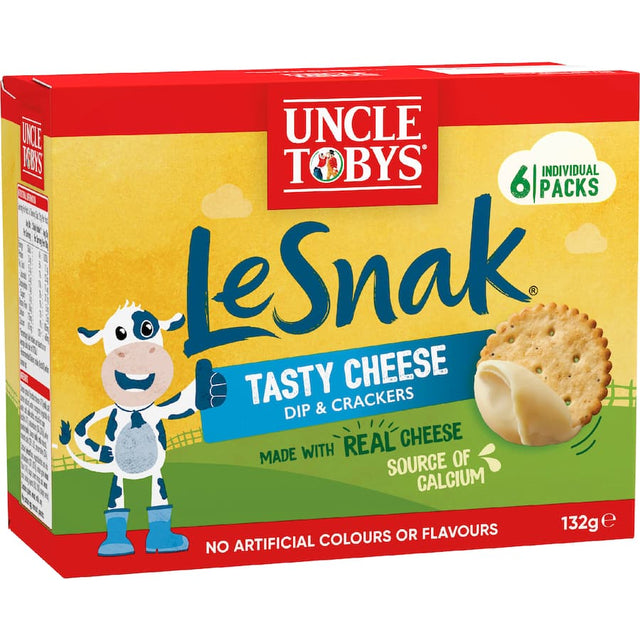 UNCLE TOBYS LE SNAK Tasty Cheese is the perfect cheese dip and cracker snack, made with delicious real cheese and available in a variety of flavours. It’s the perfect lunchbox snack or great for the family that’s out and about. UNCLE TOBYS LE SNAK is also a tasty source of calcium, so why don’t you dip into some yummy goodness this lunchtime?Try our other appealing varieties like Cheddar and French Onion.